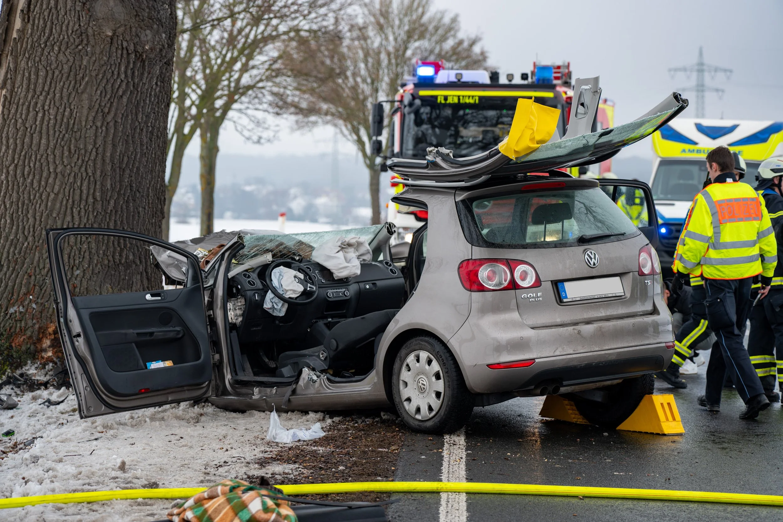 Am heutigen Mittag ereignete sich auf der Bundesstraße 7 kurz vor Isserstedt ein schwerer Verkehrsunfall. Der Fahrer eines VW Golf war aus Weimar kommend in Richtung Jena unterwegs, als er kurz vor dem Kreisverkehr aus bislang ungeklärter Ursache von der Fahrbahn abkam und frontal gegen einen Baum prallte.