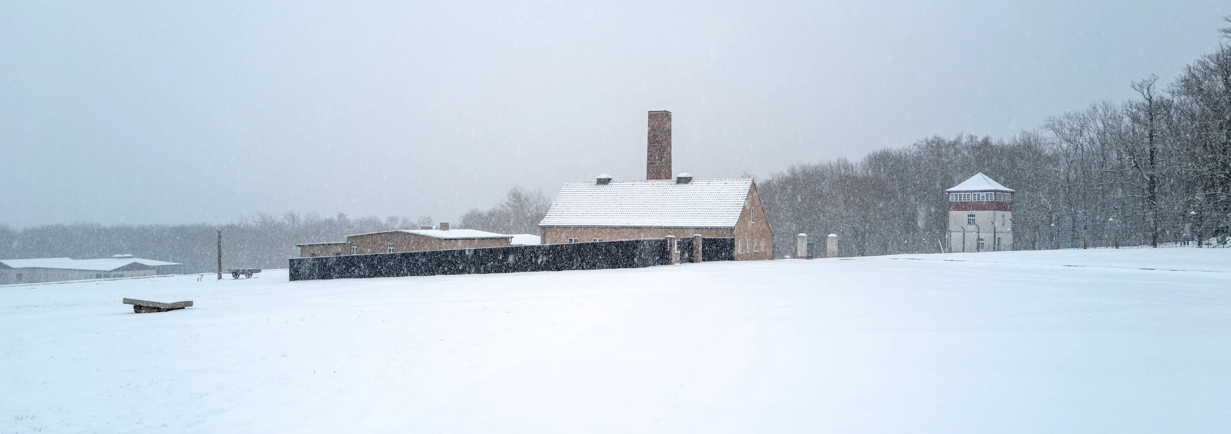 Diesmal nutze ich den dichten Schneefall für meine Aufnahmen. Die Szenerie wirkt dadurch noch beklemmender. Während der eisige Wind über den Appellplatz fegt und die Schneeflocken vor der Kamera tanzen lässt, wird mir die Grausamkeit des Ortes schmerzlich bewusst. Für mich ist es nur ein kurzer Moment in der Kälte; für die Inhaftierten hingegen war dies der mörderische Alltag im Winter auf dem Ettersberg. Es bleibt die Hoffnung, dass sich solcheVerbrechen gegen die Menschlichkeit niemals wiederholen.